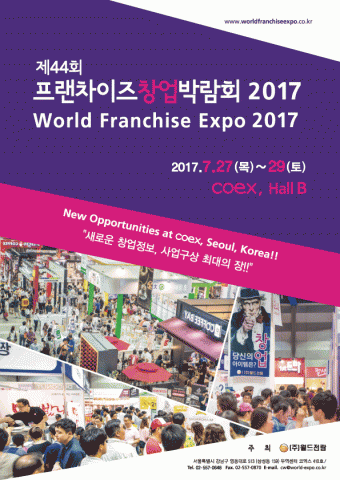 ▲ 제44회 프랜차이즈 창업박람회 2017 Coex 포스터(주)월드전람이 주최하는 ‘제44회 프랜차이즈 창업박람회 2017 COEX’가 7월 27일(목)~29일(토) 서울 코엑스 B홀에서 열린다.
